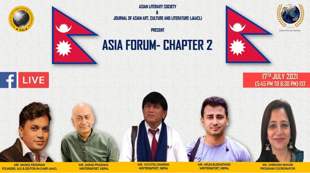 Asian Literary Society and Journal of Asian Art, Culture and Literature (JAACL) have initiated a new forum with the purpose of interaction with literary luminaries from other Asian countries. The second chapter in this series, Asia Forum – Chapter 2: Nepal was conducted as a virtual event on Saturday, 17th July 2021 at 1745 hours (5:45 PM) IST.