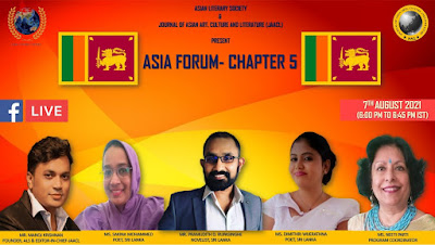 To honor literary luminaries and artists for their invaluable contribution in the field of art, culture, and literature, Asian Literature Society and Journal of Asian Art, Culture and Literature (JAACL) organized ASIA FORUM CHAPTER 5 on 7th August 2021 at 6PM with the focus on Srilanka.